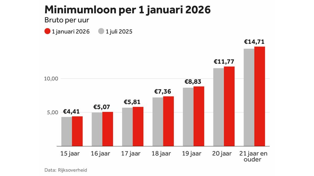 Ieder halfjaar past de overheid het minimumloon aan. Dat gaat nu van 14,40 naar 14,71 euro per uur bruto. Dat bedrag geldt voor iedereen van 21 jaar en ouder.